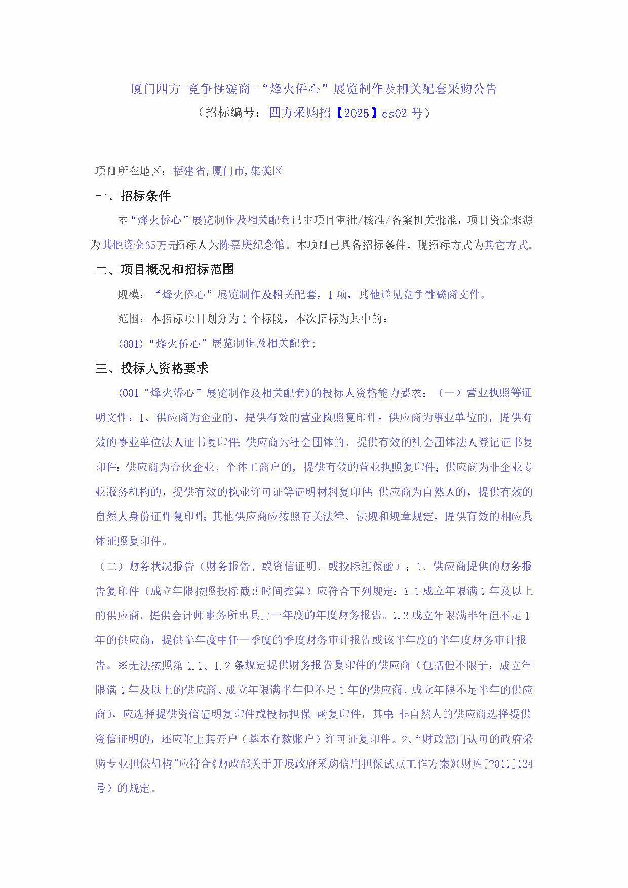 厦门四方-竞争性磋商-“烽火侨心”展览制作及相关配套采购公告