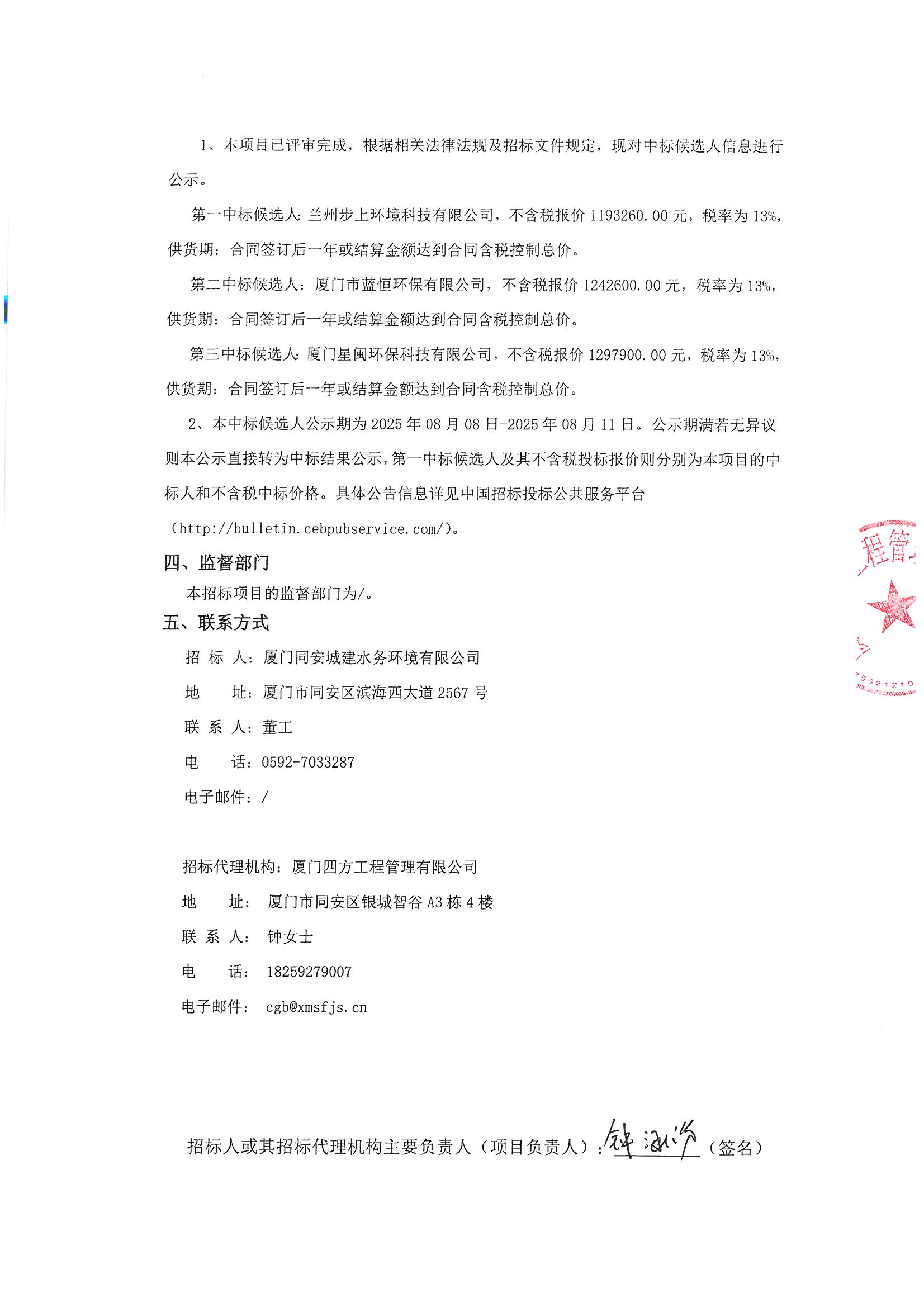 厦门四方-四方采购招【2025】gk02号-公开招标-乙酸钠等药剂采购-中标候选人公示